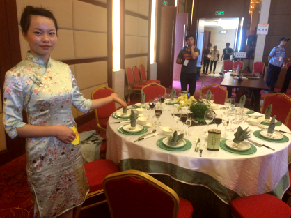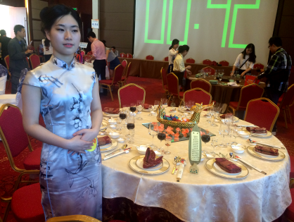 本次大赛由由浙江省教育厅主办,共有来自全省15所院校的29名选手参加了本次比赛。在为期一天的技能大比拼中,选手们充分展示了自身良好的综合素质,并在理论笔试、仪表仪容展示、台面创意设计、现场专业技能比赛、英语口语等环节展开激烈角逐,我院选手来自酒店管理专业S421414班的廖文燕许婷婷两位同学以主题“江南竹韵”、“福瑞端阳”“中餐主题宴会设计”等奖。
