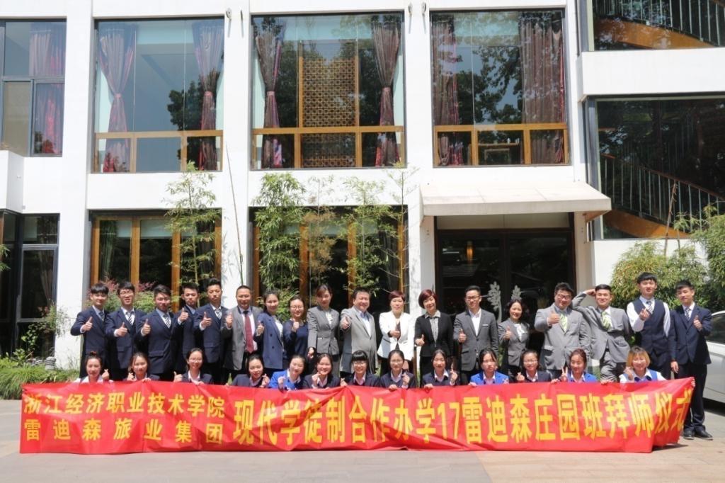 4月17日,一个春光明媚的日子里,我校管理技术学院雷迪森庄园班拜师仪式在杭州龙井雷迪森庄园酒店举行。该班学生由雷迪森旅业集团与学校从酒店管理专业17级学生中共同挑选产生。雷迪森旅业集团副总裁傅京女士、雷迪森旅业集团人力资源总监张琦女士、雷迪森旅业集团龙井庄园酒店总经理蒋增红先生、华体汇app全站版管理技术学院院长吕超、副院长张秋埜、办公室主任杨明峰、庄园班班主任叶锡临、雷迪森旅业集团人事助理陈泠等人共同出席拜师仪式。