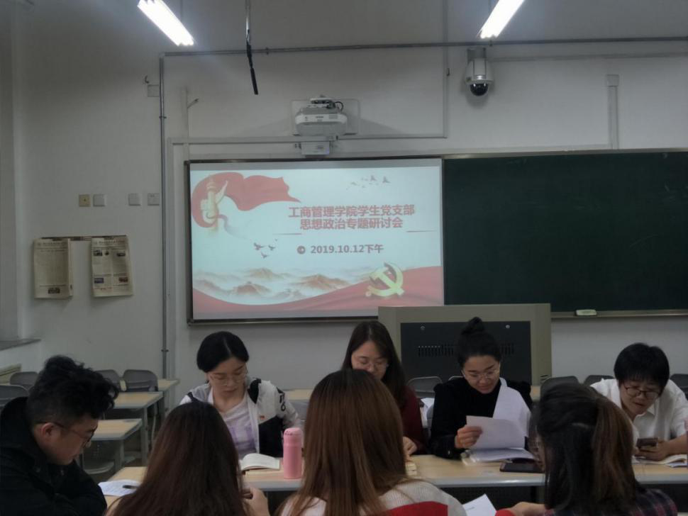 2019年10月12日12点,工商管理学院学生党支部在黄泽楼2403教室开展了专题研讨会,此次研讨会围绕党的政治建设、全面从严治党、理想信念、宗旨性质、担当作为、政治纪律和政治规矩、党性修养、廉洁自律等八个方面开展,工商管理学院学生党支部全体成员参加了此次研讨会。