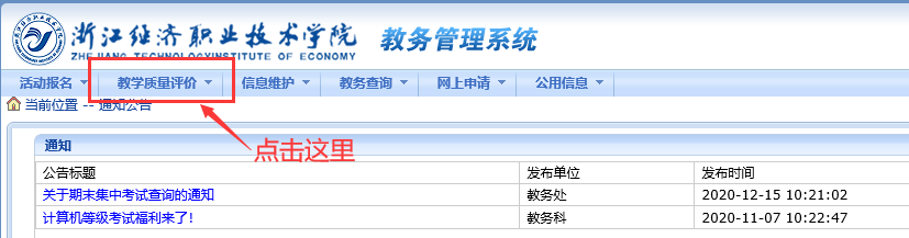 在教务处网站或从学院网站首页“信息门户”进入,选择【教务系统】后才能进入教务系统。点击【教学质量评价】后对本学期每门课程进行评价,多个教师上课的须对每个教师进行评价,所有课程评价结束后,方可提交。
