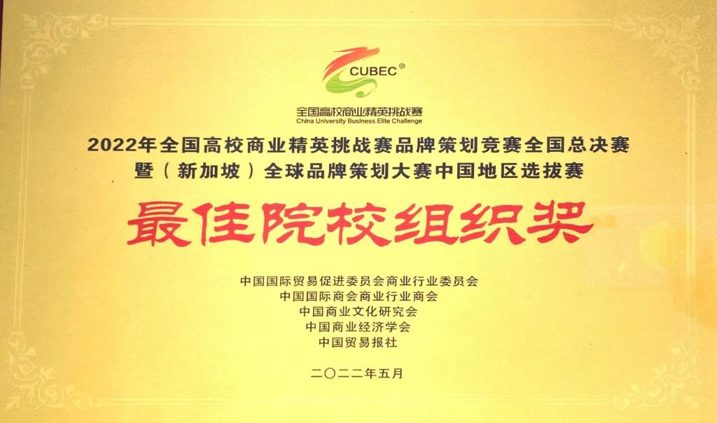 2022年5月,我院师生在刚刚结束的2022年全国高校商业精英挑战赛品牌策划竞赛全国总决赛暨(新加坡)全球品牌策划大赛中获得佳绩。教师组洪李甜和王世波老师分别斩获一等奖和二等奖,学生组斩获一等奖3项,二等奖2项,学校被授予最佳院校组织奖证书及奖牌。