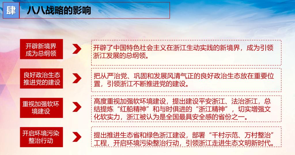 其次,与会全体师生共同观看浙江精神与“八八战略”党史微课,按照科学发展观的要求,结合实际作出的总体把握将已经显现出来的优势进一步发挥好,将潜在的优势变为现实的优势,对于一些劣势通过努力转化为优势,或者避开劣势,同时谈论了自己的心得体会与感想。