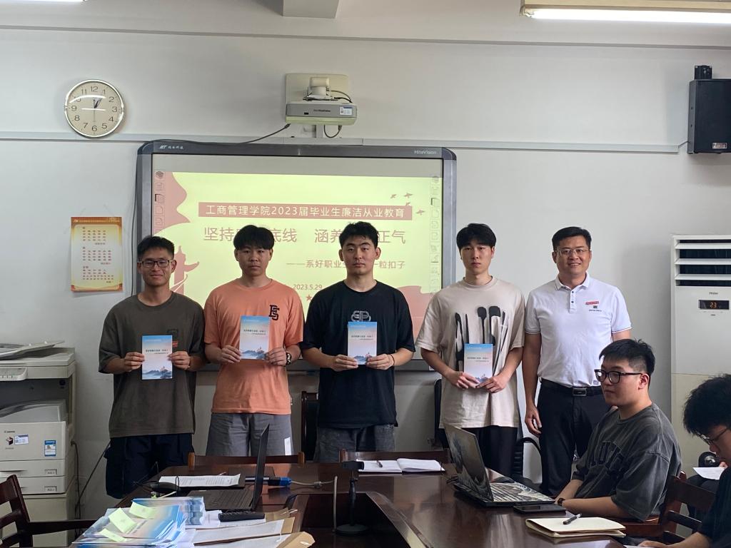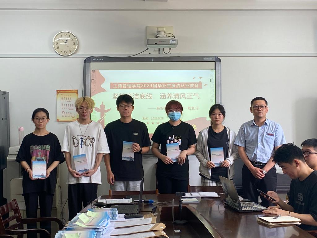为进一步增强毕业生廉洁从业意识,牢固树立正确的世界观、人生观、价值观,坚持廉洁底线,涵养清风正气,系好职业生涯第一粒扣子,工商管理学院于5月29日在会议室开展2023届毕业生廉洁从业教育,学院党总支书记、副院长吴峥,党总支副书记张穹,全体辅导员、校友联络员及毕业生代表参加。