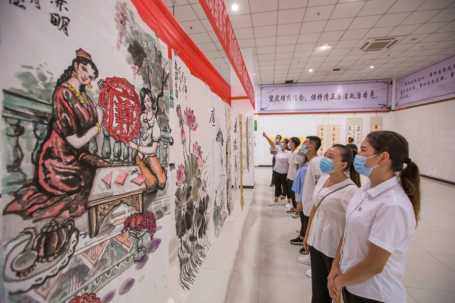 新疆维吾尔自治区库车市纪委监委联合市文联举办“清廉润库车 笔墨展风貌”廉洁书画作品展,共展出书法、绘画、漫画等原创作品90余幅,营造崇廉尚廉、风清气正的廉洁文化氛围。图为该市年轻党员干部参观绘画作品展。(新疆维吾尔自治区库车市纪委监委供 袁欢欢 摄)