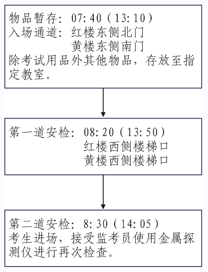 本考试采用二次安检,除考试用品外其他物品不可通过第一道安检门。安检流程如下: