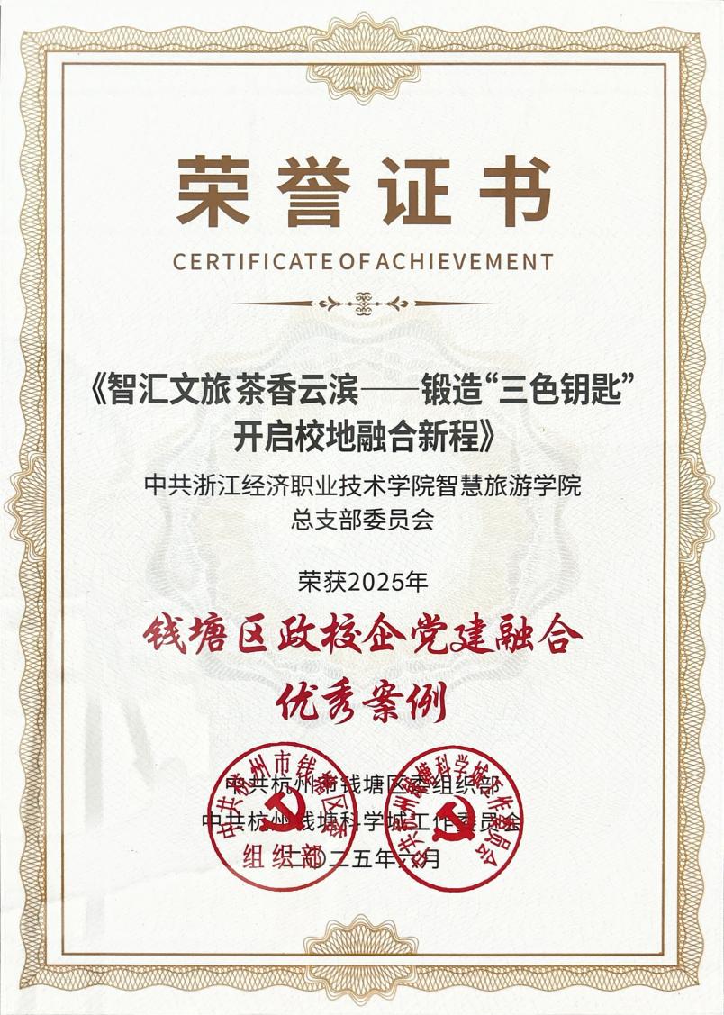 6月30日,在钱塘区科学城党工委举办的“笃行实干攀新高 勇担使命启新程”“两企三新”党建工作推进会暨政校企党建融合迎“七一”主题党日活动中,我院《智汇文旅 茶香云滨——锻造“三色钥匙”开启校地融合新程》政校企党建融合案例获表彰。
