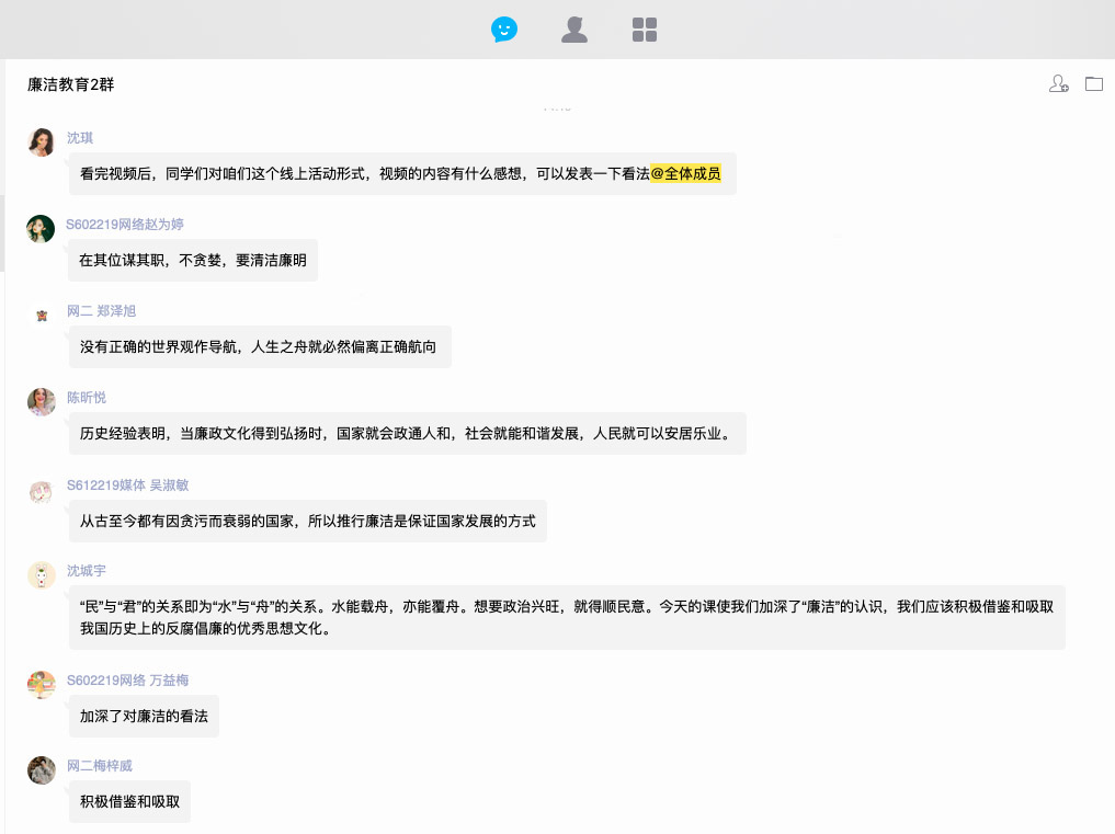 由于新冠疫情的影响,本次活动以线上观看教育视频的方式举行。数信思研会的工作人员们组织线上放映群,在线签到和签退,同学们认真观看教育视频,在群内在线积极讨论,分享自己对于廉政自律的看法。在观影结束后同学们也纷纷写下观后感。