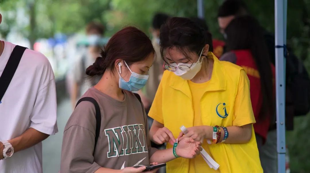 早上八点,身着明黄色院服的志愿者们好似第一抹骄阳,为每一位前来报道的同学送上了新学期的第一份慰问。他们主动热情,一边引导同学们出示健康码,一边引导学生们佩戴好报到手环;他们坚持负责,无论是早日逐渐升高的气温或是午间不期而来的暴雨,他们也都在志愿服务一线默默坚持,为每一位返校的同学送上健康返校指南。