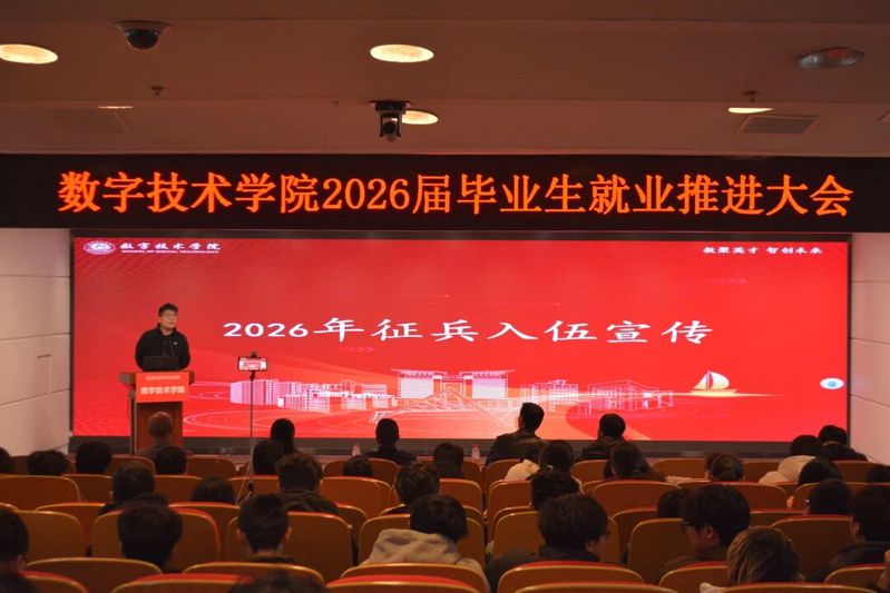 12月8日,数字技术学院在行政楼三楼报告厅举行的2026届毕业生就业推进大会上,专门设置了征兵宣传环节。负责人武工作辅导员吴杰老师围绕2026年征兵政策,系统讲解了征兵条件、报名流程、部队发展路径以及国家优待政策等内容,鼓励毕业生把握时代机遇,勇担青春使命,积极投身强军伟业。