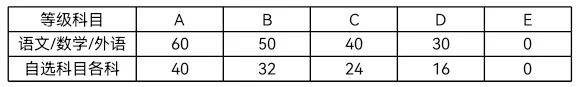 学考折算分取学业水平考试六门科目换算分值之和,满分为300分,由语文、数学、外语和3门自选科目组成。其中,语文、数学、外语三门科目各科满分60分;自选科目各科满分40分,自选科目由学校从技术、政治、历史、地理、物理、化学、生物中选择成绩最优的三门,从高分到低分依次为自选科目1、自选科目2、自选科目3。考生需在规定的时间内核对折算成绩,换算如下表所示: