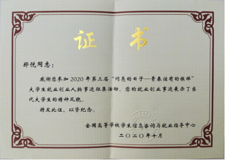 招生就业处于今年五月组织基层就业、创业人物、军营战士三类典型人物案例评选,经打磨,我校郑悦同学入选教育部全国高等学校学生信息咨询与就业指导中心主办的第三届“闪亮的日子——青春该有的模样”大学生就业创业人物,浙江省15名大学生入选。(全省共有5所高职入围)