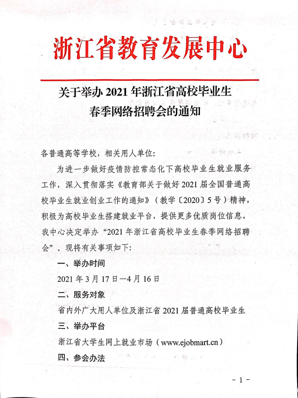 (转)关于举办2021年浙江省高校毕业生春季网络招聘会的通知