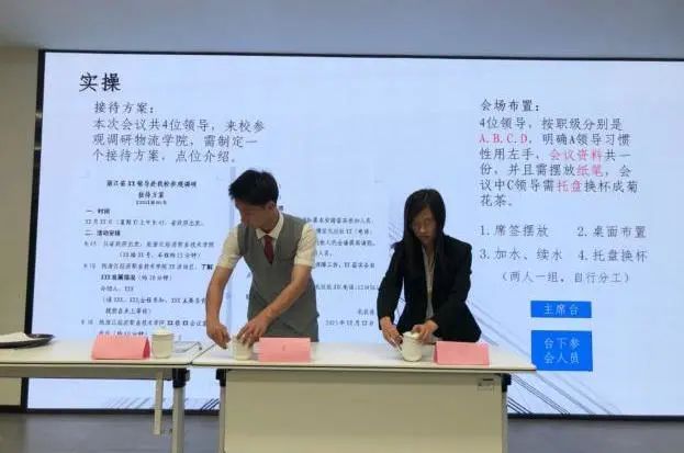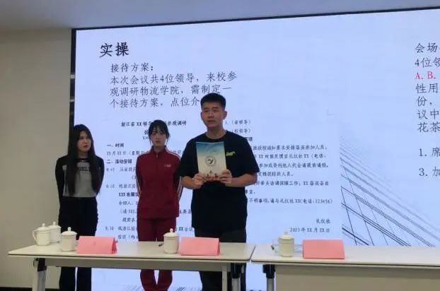 在介绍接待中期时,陈奕宇亲身演示了会场服务保障中的桌面整理、倒茶礼仪。为了让同学们切身领悟高水平接待礼仪精神,他还为同学们准备了一次接待实操训练,同学们积极响应。陈奕宇以布置接待为例开展实操,让同学们按照参会人员的职级,摆放席签、准备会议资料、并根据参会人员的特殊要求续水、加水。在陈奕宇的细心指导下,数名参与实操的同学根据会场布置要求,成功完成席签摆放、桌面布置、加水、续水和托盘换杯的接待工作。