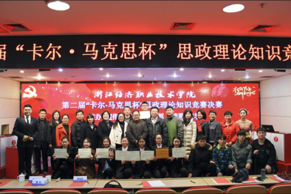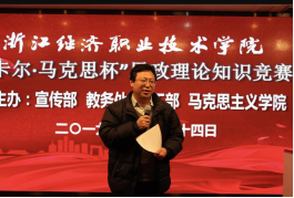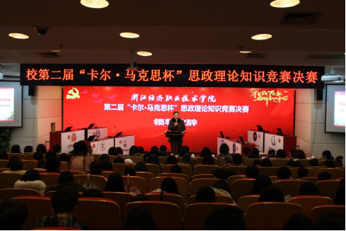 12月24日晚,校第二届“卡尔·马克思杯”思政理论知识竞赛决赛在崇学楼三楼报告厅隆重举行。校党委副书记、院长邵庆祥莅临大赛现场并致辞;校党委委员、组织部长、宣传部长陈专,教务处处长潘凤钗,学工部部长柳虹,各二级学院总支书记(院长)罗振华、沈海伦、徐晓玲、易际培、张妮佳、王细红、梁丽华、郑芝玲、程凡及各二级学员辅导员等应邀参加;大赛特邀浙江工商大学马克思主义学院院长陈华兴、浙江工商大学马克思主义学院党总支书记崔杰、浙江金融职业学院马克思主义学院院长曲士英、浙江经贸职业技术学院马克思主义学院副院长王兆婷等嘉宾出席;参赛选手和学生代表300多人参加,报告厅座无虚席。