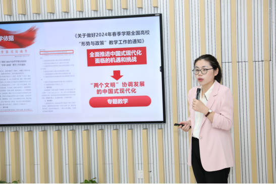 赛前,党委副书记吕红刚为比赛致辞。他希望马院教师认真学习习近平总书记对学校思政课建设作出的重要指示精神,强调不断开创新时代思政教育新局面,不断提高思政课的针对性和吸引力。本次比赛共有来自我院3个教研室5名老师参赛。参赛教师们充分展示了各自的教学风采。他们通过深入浅出的讲解、生动有趣的案例、丰富多彩的互动环节,将抽象的理论知识转化为具体可感的教学内容。李继冉老师以安吉白茶黄杜村的故事,阐述了“两山”理念从安吉走向全国甚至世界的故事;郝俊潇老师从两只兔子价格的对比为导入,结合自身李祖村考察经验讲述了新时代乡村振兴的意义;余文娟老师从贵州“村超”出发,深入解读了中国式现代化为什么是物质文明和精神文明相协调的现代化;陈繁老师则是结合当前年轻人“在上班和上进中选择了上香”的现状,结合桂海潮和杨洪琼的成长经历,引导学生树立积极进取的人生态度;董凌芳老师结合《年轻的朋友们来相会》的歌曲,从新中国第一台拖拉机、第一辆汽车以及第一艘核潜艇的故事,详细解读了“四个现代化”。通过本次教学能力比赛(公开课),参赛老师们的教学质量得到提升,也为其他老师的思政课教学提供了视角和经验参考。