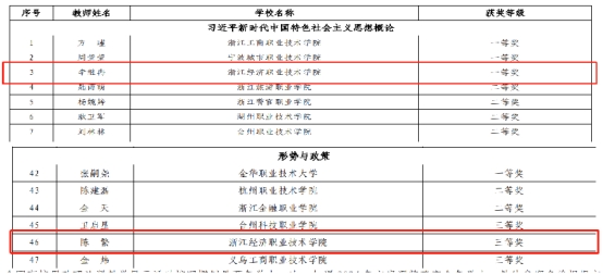7月28日至30日,2024年浙江省高职院校教学能力比赛现场决赛在金华职业技术大学落下帷幕。我院教师李继冉、陈繁分别荣获思想政治理论课程组“习近平新时代中国特色社会主义思想概论”课一等奖,“形势与政策”课三等奖。