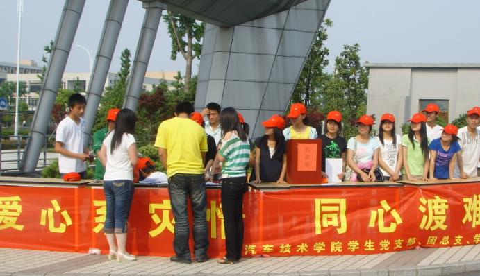 5月14日星期三下午,汽车技术学院学生党支部、团总支、学生会、社团联合会以及众多志愿者自发组织在学校北门门口开展了名为“爱心系灾情,同心渡难关”的募捐活动,号召全院学生积极为在四川汶川地震中受难的国人伸出援助之手,帮助灾区人民渡过难关。夏日午后猛烈的阳光并没能阻挡我校师生对受灾同胞的关心,大家纷纷慷慨解囊,本校人文部教师叶青老师更是当场将2000元现金投入捐款箱。截止15日中午,共募集8769元,其中汽模班(班级人数20人)捐款2440元。