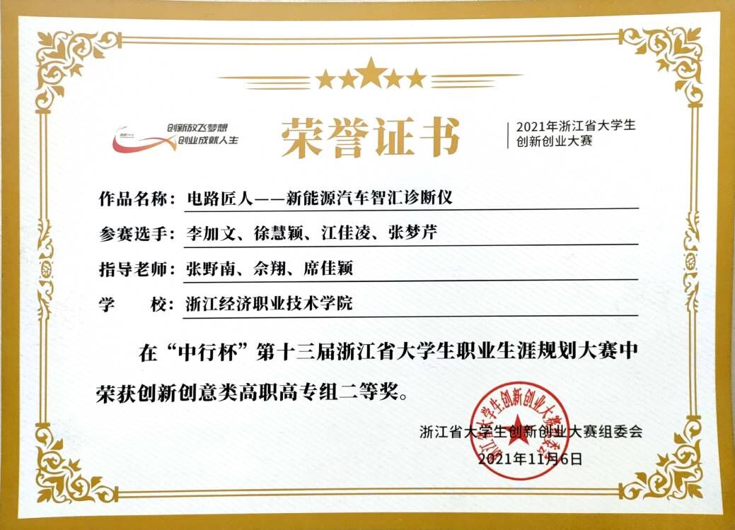 2021年获“中行杯”第十三届浙江省大学生职业生涯规划大赛二等奖