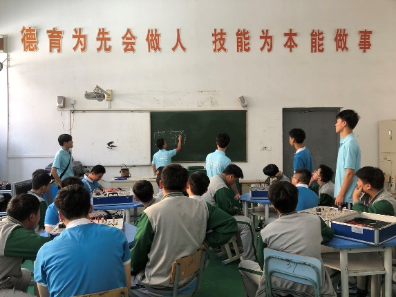为激发当学生的学习热情,实践团成员结合自己的专业知识,精心设计了一节“继电器控制电机的并联电路连接”实训课。
