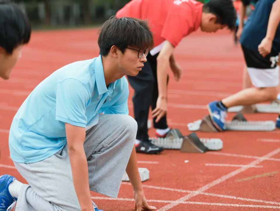 预备在赛场的起跑线,枪声响起,运动健儿们便卯足劲向前冲刺,直奔终点。