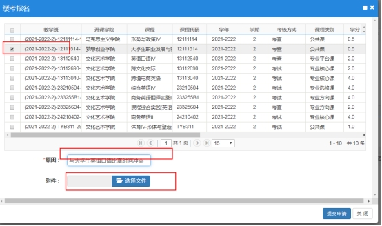 选择缓考报名,查阅报名说明,选择缓考课程,填写原因,上传附件(必填)