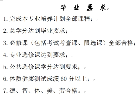 (八)毕业要求:学生完成本专业培养计划全部课程,总学分达到毕业要求,经考核合格,体质健康测试成绩60分以上,并获得相应的职业技能等级证书(或职业资格证书) 准予毕业。培养计划因各专业要求不同,请各专业同学自行在教务系统里查看对应专业人才培养方案。路径:新版教务--信息查询--教学执行计划查看。具体选修课类别及证书要求有疑问可咨询各专业主管。
