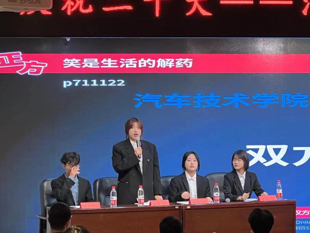 由P711122班应倩、沈奕航、朱琳、姚籽妘四人组成的正方队伍“笑是生活的解药”,与S711122班缪振翔、郭浩、薛佳乐、余家豪四人组成的反方队伍“笑不是生活的解药”,开展精彩绝伦的辩论。