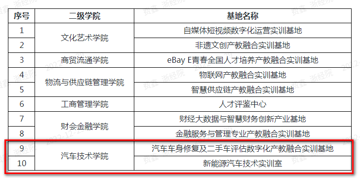 根据《关于申报校级高水平产教融合实训基地的通知》(浙经教函〔2022〕69号)文件精神,通过自主申报、教务处初审、校外专家评审等程序,我院级汽车车身修复实训室和新能源汽车实训室入选2022年校级高水平产教融合实训基地。