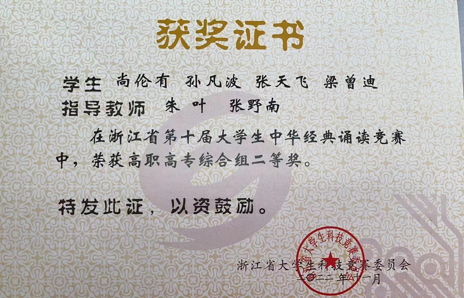 2022年获浙江省第十届大学生中华经典诵读竞赛二等奖
