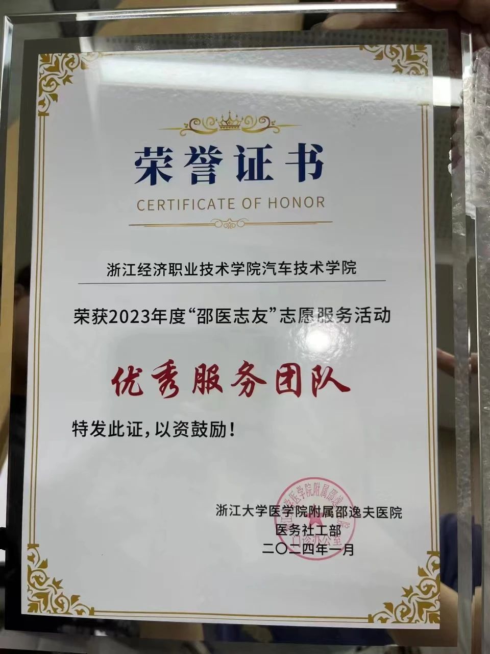 邵逸夫医院与汽车技术学院一直保持长期合作。为感谢“汽车之鹰”志愿服务队同学们的辛勤付出,汽车技术学院荣获2023年度“邵医志友”服务活动“优秀志愿者团队”称号,鼓励他们继续用爱心与行动,传承志愿服务精神,奏响无悔奉献篇章。