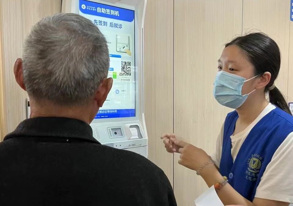 在经过简单系统性的培训后,志愿者们以饱满的热情走上各自的志愿服务岗位,帮助患者或家属使用自助机或手机端进行挂号、缴费、取化验报告单等,引导患者就诊,维持医院文明就诊秩序,为行动不便、无陪护老年患者提供陪诊等温馨服务。