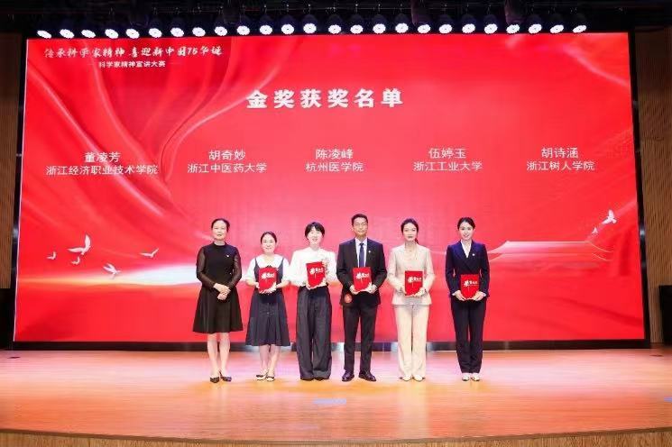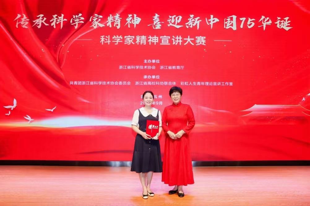 9月29日,由省科协、省教育厅联合主办,共青团浙江省科协委员会、省高校科协联合体、彩虹人生青年理论宣讲工作室承办的“传承科学家精神,喜迎新中国75华诞”科学家精神宣讲大赛决赛在省科协报告厅举行,我校马克思主义学院青年教师董凌芳历经初赛、复赛,以唯一高职院校选手入围了决赛,最终以第一名的成绩荣获金奖。