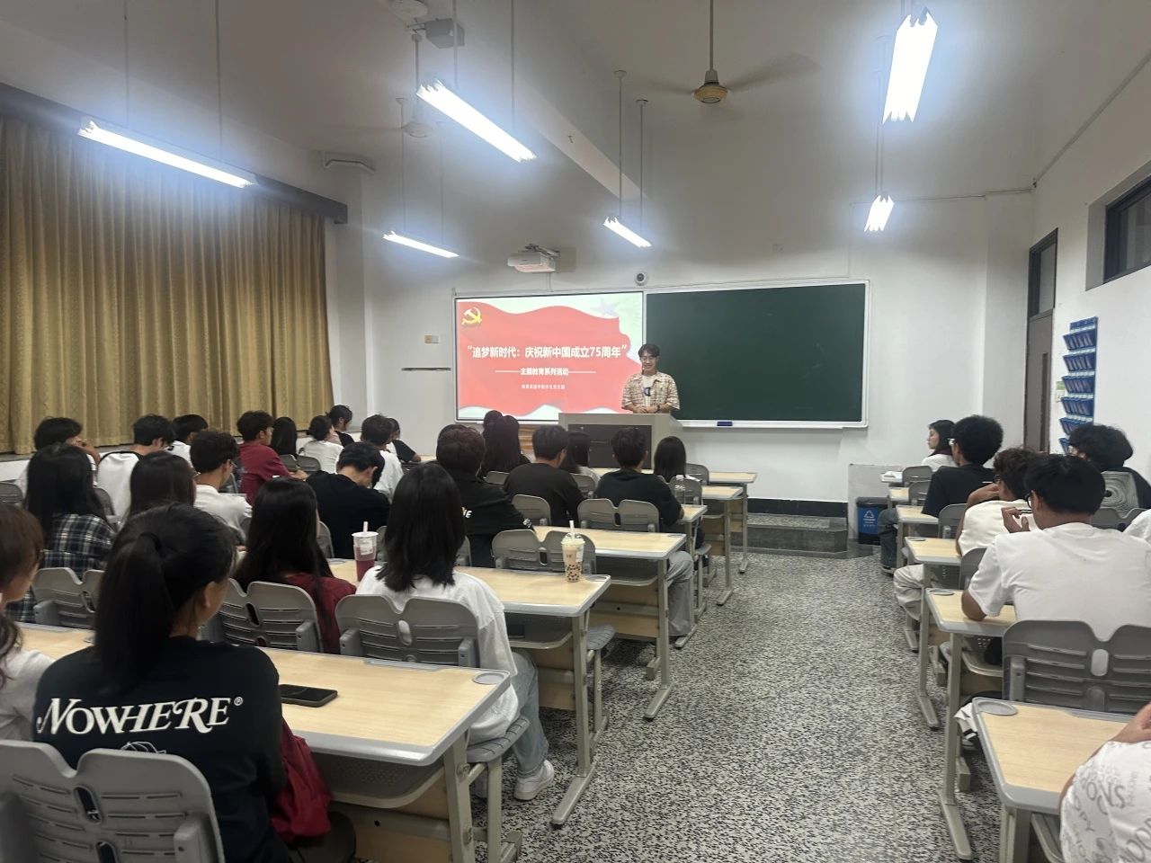 百年征程波澜壮阔,七十五载砥砺前行。在新中国成立 75 周年之际,商贸流通学院学生第一、第二党支部于2024年9月26日晚6点在红雨楼各教室开展了主题教育宣讲活动。
