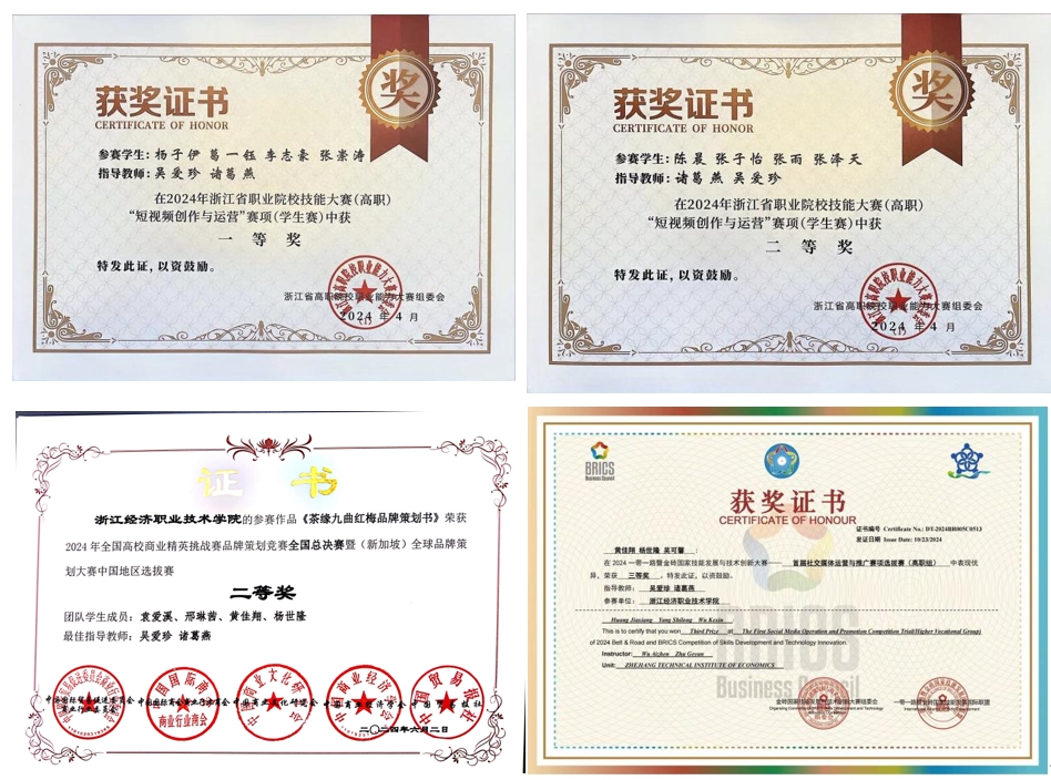 1.2024年浙江省职业院校技能大赛(高职)“短视频创作与运营”赛项(学生赛)中获一等奖;
