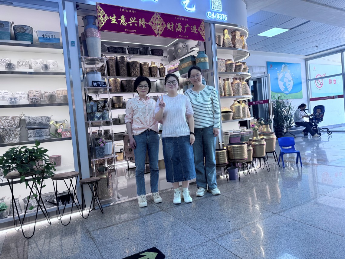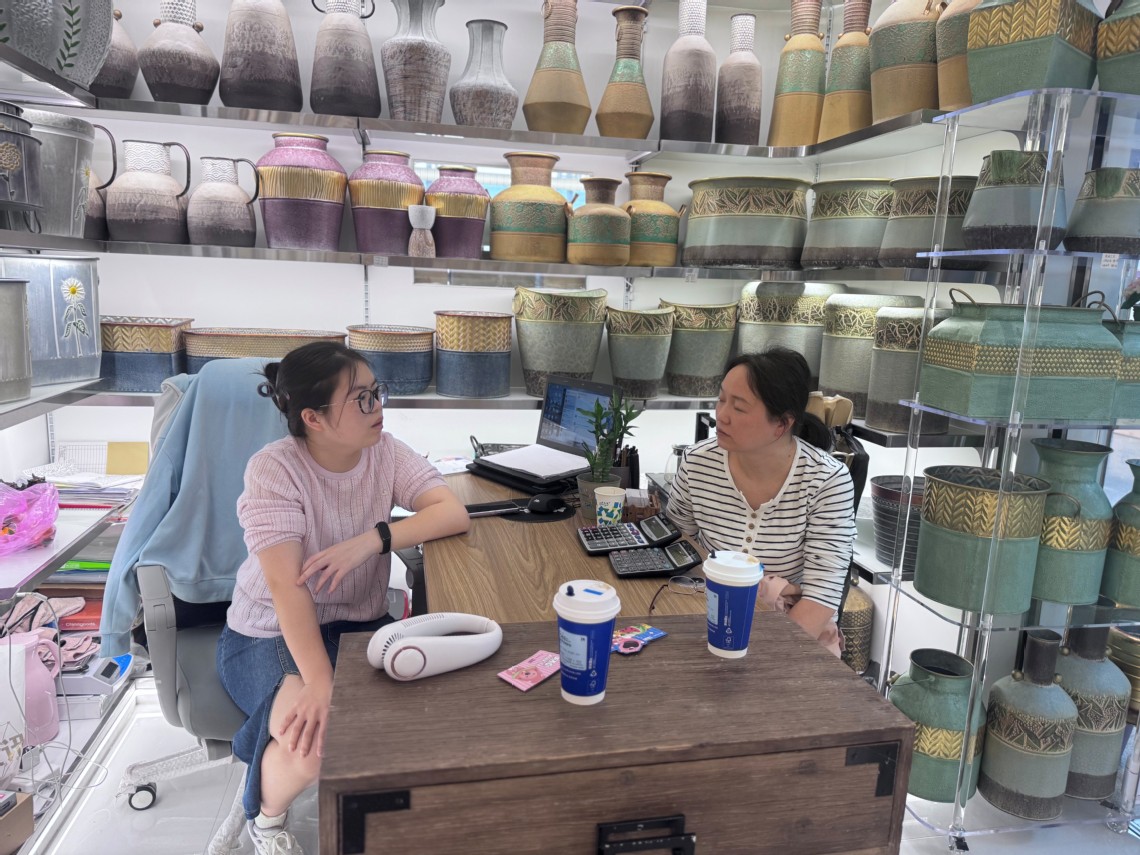 而在义乌,蒋丽清、游蓓蕾老师走进义乌国际商贸城,来到吴佳倩实习的义乌市竞涵饰品商行。该商行专注中东市场工艺品出口,已深耕中东市场 12 年,年出口额超 3000 万元,主营金属器皿、树脂装饰品等工艺品。商行总经理介绍:“中东客户注重性价比,但对宗教元素嵌入要求严格。” 经过三个月实习,吴佳倩在客户沟通、订单跟进、报关单证制作等方面成果显著。老师们与吴佳倩深入交流,蒋丽清老师建议她深入学习中东文化习俗,以更好把握客户需求,同时鼓励她参与跨境电商直播,开拓新销售渠道。游蓓蕾老师则针对贸易风险管控,现场指导了产品跟单的要点。巡视间隙,教师们走访了义乌二十余家商户,发现中东订单近两年增长 15%,智能家居装饰品成为新增长点。两位老师与企业探讨了校企合作开发文化IP产品的可能性,为课程改革提供依据,也为数字贸易运营工作室的开展做了市场调研。