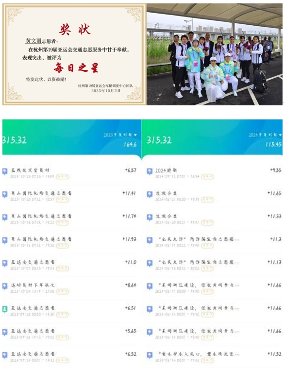 在社会实践中她,将所学知识应用于实际,助力数字产业集群化。在亚运会期间,成功入选志愿者。她被分配到交通指引岗位,尽管赛事期间工作强度大、任务重,但她始终保持热情与耐心。面对来自世界各地的运动员,她用流利的英语和灿烂的笑容为大家提供帮助,以实际行动诠释了志愿者精神,赢得多方赞誉,累计志愿服务时长已达三百多小时。这些经历不仅让她收获了满满的幸福感,更让她深刻的理解了责任和奉献的真滴。她用实际行动诠释了新时代去青年的责任与担当。