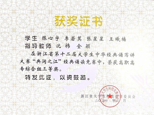 浙江省第十届大学生中华经典诵写讲大赛“典润之江”经典诵读竞赛综合组三等奖