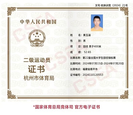 当电子计时器定格在52.65秒的那一刻,黄玉涵的呼吸还未平复,眼眶却已微微发热。这个数字意味着太多——无数个烈阳底下的坚持,每次力竭时仍强迫自己坚持下去的倔强,还有那份深藏心底却从未宣之于口的渴望。虽然在全国大学生田径锦标赛的400米赛场上未能取得名次,但国家二级运动员这个曾经遥不可及的标准,如今终于被他稳稳握在手中。这份达标证书不仅是对他竞技水平的认可,更是对那个永不放弃的自己最好的褒奖。从此,他的跑道将延伸向更远的远方,而今天的成绩,注定会成为新征程的起点。