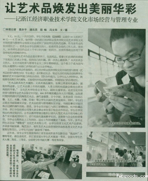 『媒体关注』《教育信息报》对我校特色专业的报道介绍 5月18日,文化市场经营与管理专业师生创新创业作品义拍会在学校外语村举行。本次拍卖会不仅为学生搭建了一个全面展示专业才能的有效平台,而且也积极探索出一条学生专业学习与创新创业实践活动相结合的有效途径,同时反映了我校特色专业建设的卓有成效。2010年5月25日的《教育信息报》在招生就业专版以《让艺术品焕发出美丽...