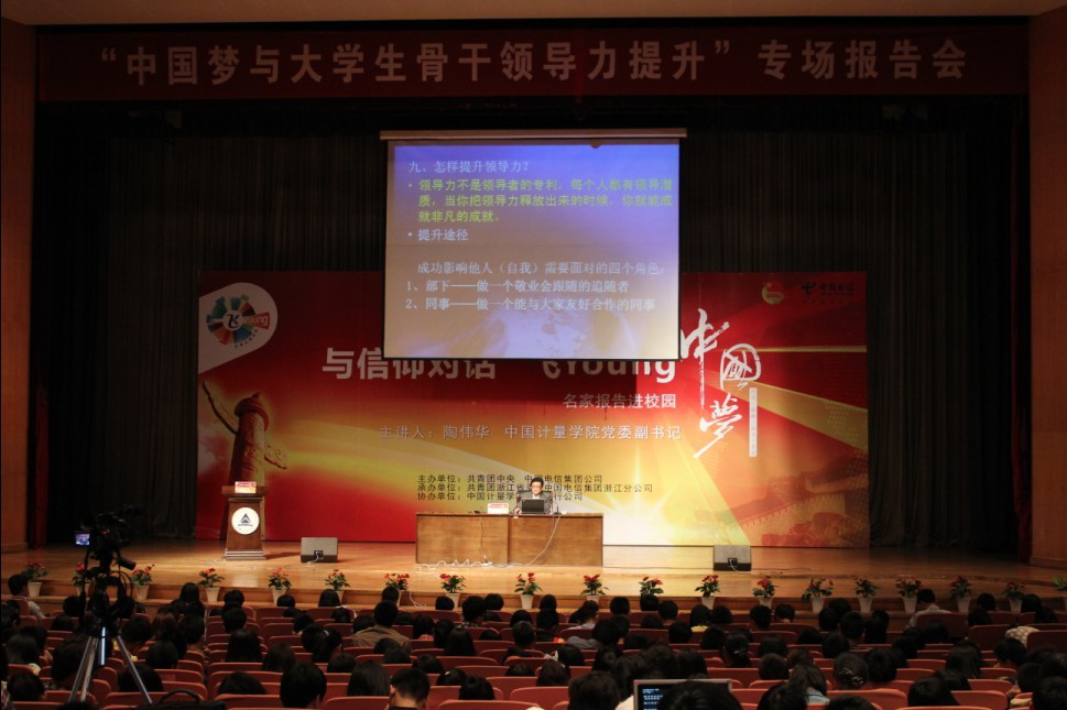 2013年4月16日下午,华体汇app全站版的部分团干部和学生青年骨干在中国计量学院嘉量大会堂,认真听取了“与信仰对话,飞YOUNG中国梦”浙江省的首场报告会。中国计量学院党委副书记陶伟华应邀作了题为《中国梦与大学生骨干领导力提升》的报告,报告在众学生中引起强烈反响。