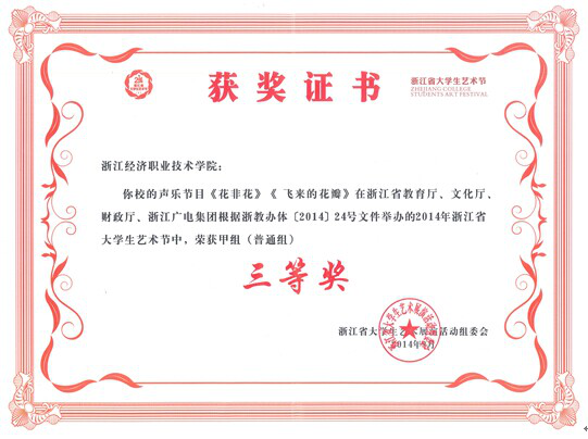 日前,由浙江省教育厅、浙江省文化厅、浙江省财政厅、浙江广电集团共同主办的2014年浙江省大学生艺术节落下帷幕。由我院团委组织录制并选送的声乐节目《花非花》、《飞来的花瓣》荣获甲组(普通组)三等奖。