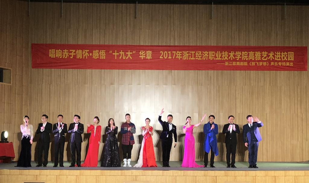 12月11日晚,2017年高雅艺术进校园——浙江歌舞剧院《放飞梦想》声乐专场演出在物产中大管理学院二楼报告厅举行。党委副书记、校长邵庆祥,学工部副部长、学生处副处长叶林良出席晚会,与700余名师生一同欣赏了演出。