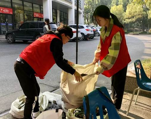 志愿者们耐心解答同学们问题,引导他们登记上个人信息,发放给捐赠者爱心卡片,整理好捐赠衣物并将衣物打包好,以便于后期的搬运。