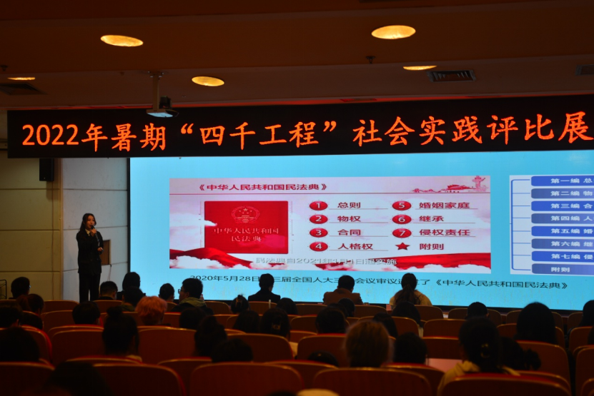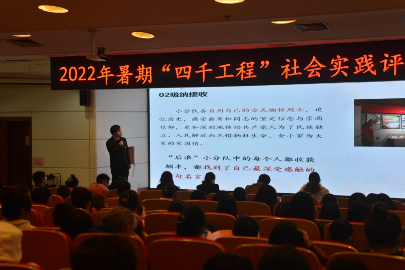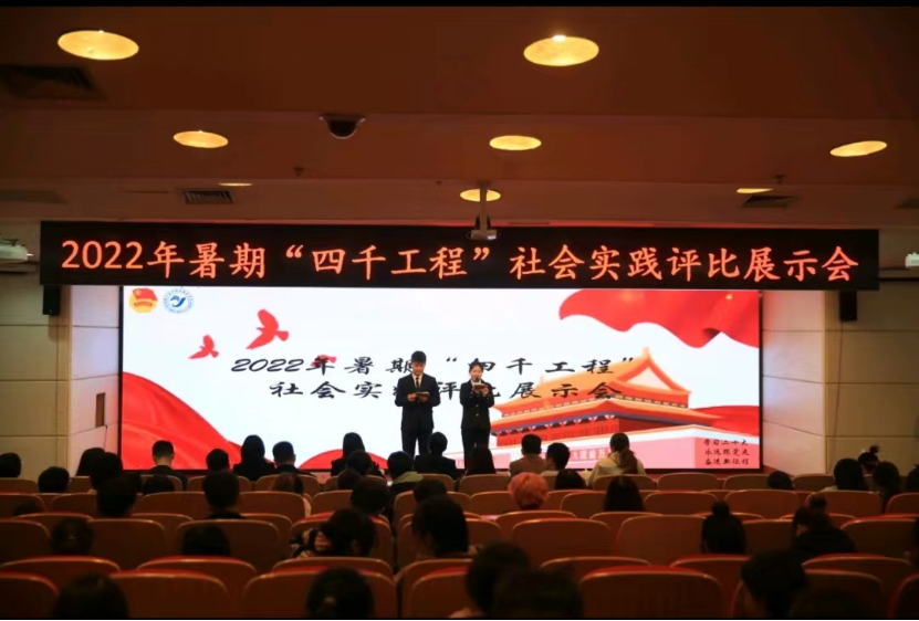 为在共同富裕和现代化先行的进程中努力绽放夺目的青春之光,用实际行动来践行党的二十大所提出的新思想和新理念,我校于11月22日在崇学楼三楼报告厅开展以“学习二十大,永远跟党走,奋进新征程”为主题的“四千工程”社会实践评比展示会。