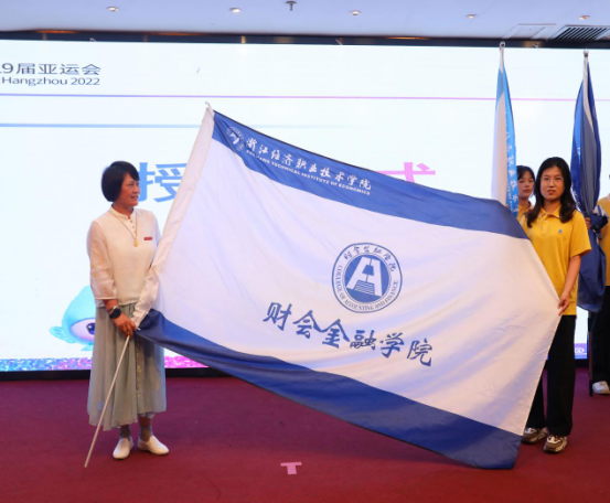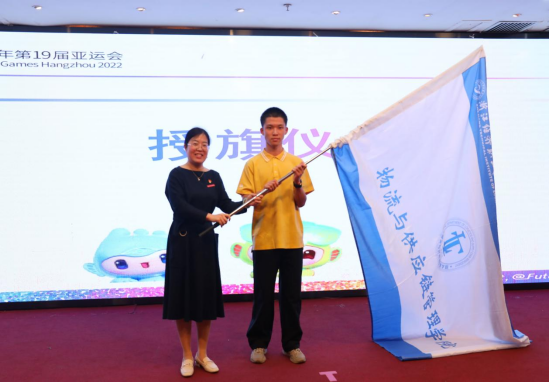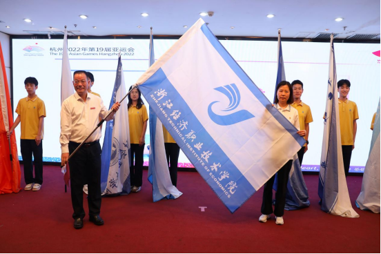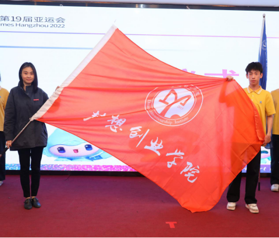 志愿者接过学院旗帜,挥舞旗帜、蓄势待发。5月28日-6月16日,我校200余名青年志愿者将参与此次亚运会“韵味杭州”中国滑板公开赛和轮滑公开赛志愿服务工作,期待经院“小青荷”们为测试赛提供“高水平、有特色、全方位”的优质服务,尽情展现经院力量、青春风采!