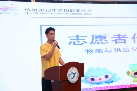 来自物流与供应链管理学院邵彬同学作为代表志愿者发言。他表示:共同的追求、理想和责任让经院志愿者们团结在“2022杭州亚运志愿者”的旗帜下,经院“小青荷”应当弘扬志愿精神,争做志愿服务理念的践行者。他代表志愿者郑重承诺:珍惜这难得的机遇,承担起传播志愿服务“奉献、友爱、互助、进步”精神的神圣职责;热爱国家,积极担当亚运会形象代表;勤奋学习,扎实工作,实现服务与成长的双赢。