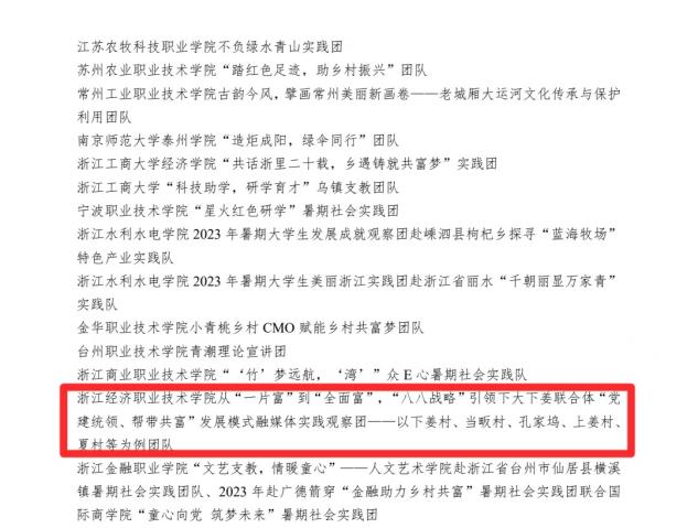 为充分展示 2023 年全国大中专学生志愿者暑期“三下乡”社会实践活动成果,共青团中央青年发展部、中国青年报、中国青年网共同举办2023年全国大中专学生志愿者暑期文化科技卫生“三下乡”社会实践“镜头中的三下乡”征集活动。经报名审核、作品发布、网络展示、综合评审等环节,我校从“一片富”到“全面富”,“八八战略”引领下大下姜联合体“党建统领、帮带共富”发展模式融媒体实践观察团——以下姜村、当畈村、孔家坞、上姜村、夏村等为例团队被评选为优秀文字团队,“弘扬台州草编文化,传承非遗时代新生”团队被评选为优秀视频团队。