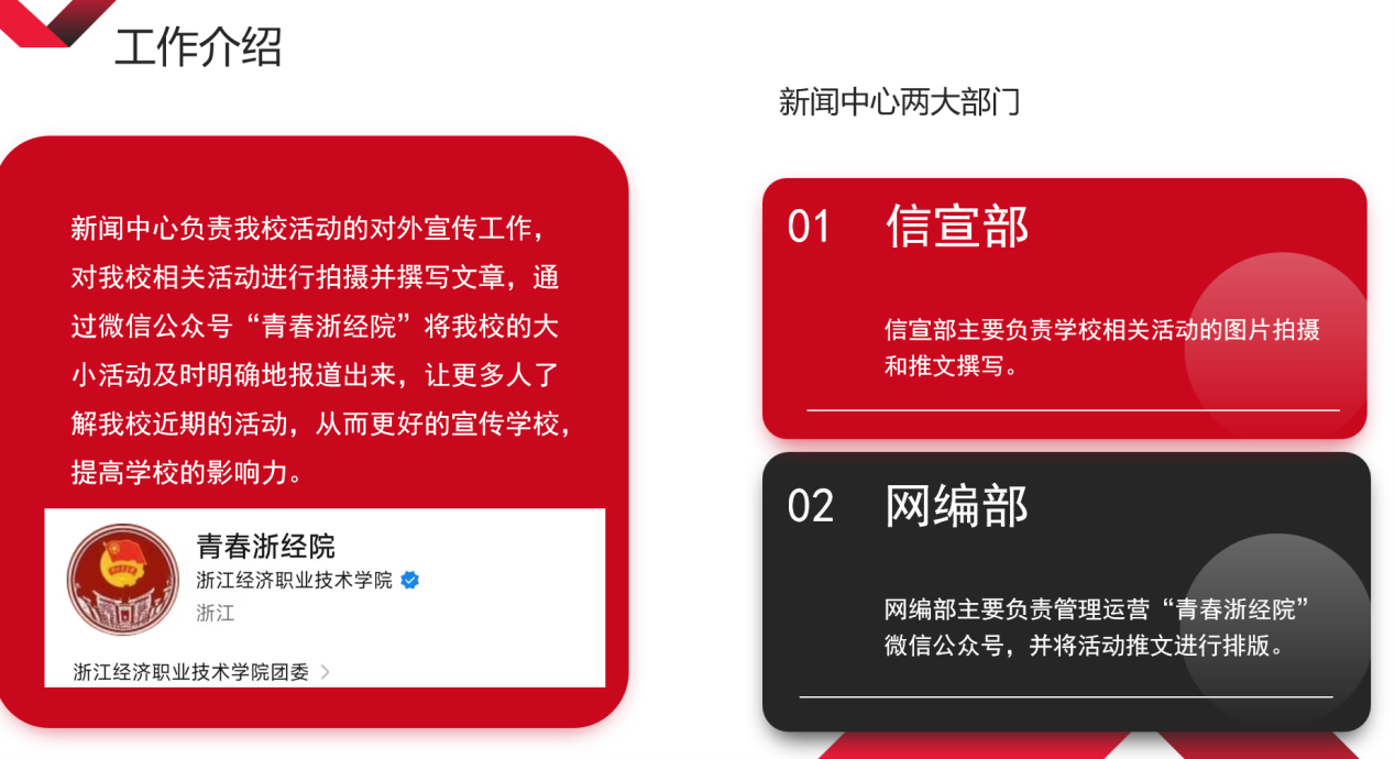 信宣部与网编部协同合作,信宣部凭借专业摄影与写作能力,为活动留下精彩瞬间并撰写生动推文;网编部精心运营“青春浙经院”公众号,通过创新排版和选题策划,提升推文吸引力与影响力,及时准确报道校园活动,展示校园风采。