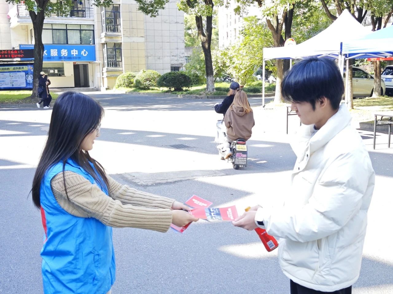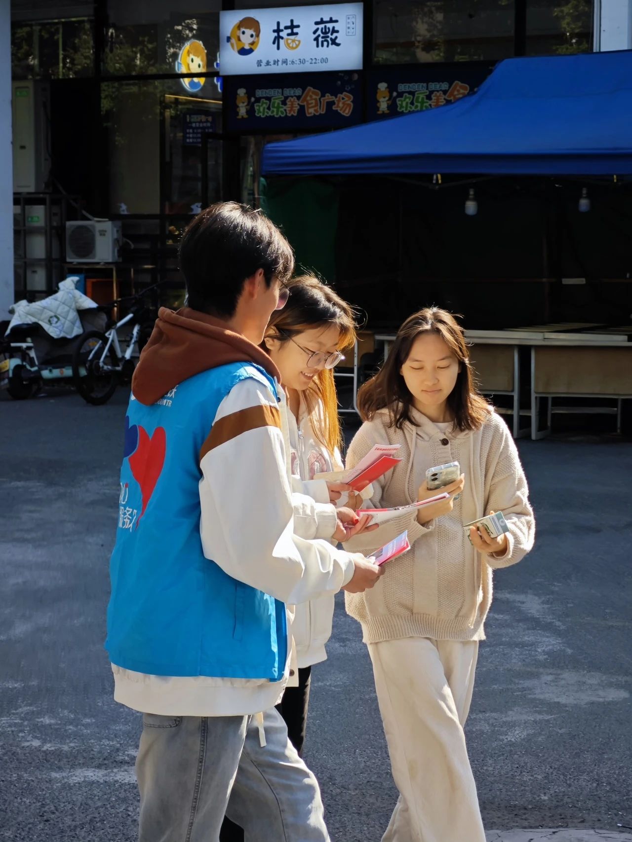 中午正是人流高峰期,冬日暖阳倾洒在生活区内,志愿者们顶着太阳,每当有同学从他们面前经过,他们都会积极向前为同学分发手册,温暖的阳光轻抚过他们微微扬起的嘴角,将笑容传递在每一个人心中。