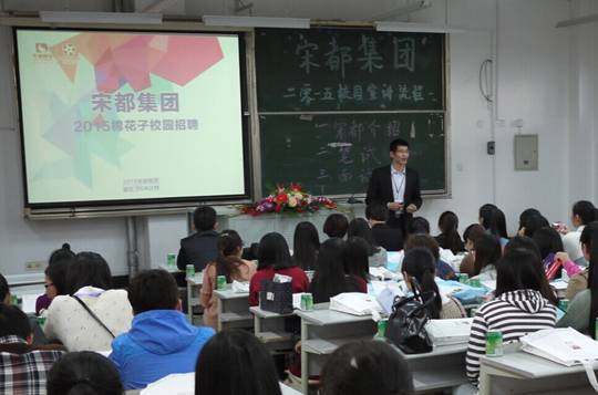 宋都房地产集团人力资源部葛明昆副总监介绍了宋都集团的发展历史、资产规模、企业文化以及未来公司发展规划等内容;人力资源部盛金涛总监介绍了该公司2015年校园招聘的具体计划、要求和福利待遇,表明了充分的诚意。